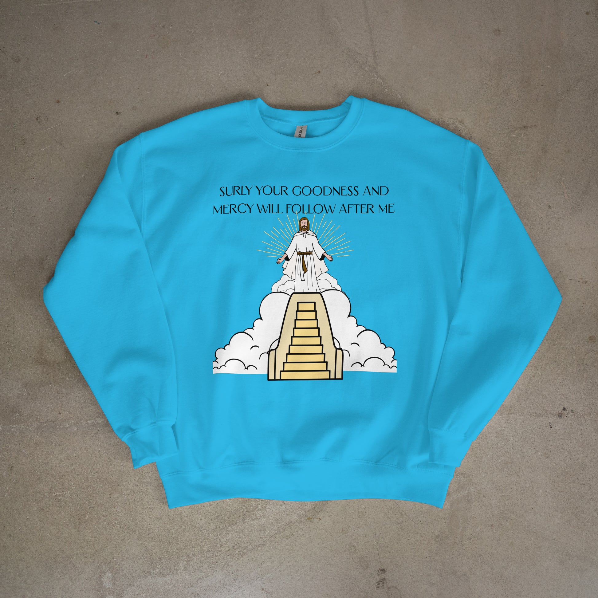 Blue crew neck hoodie with a stair way to Jesus and his kingdom
